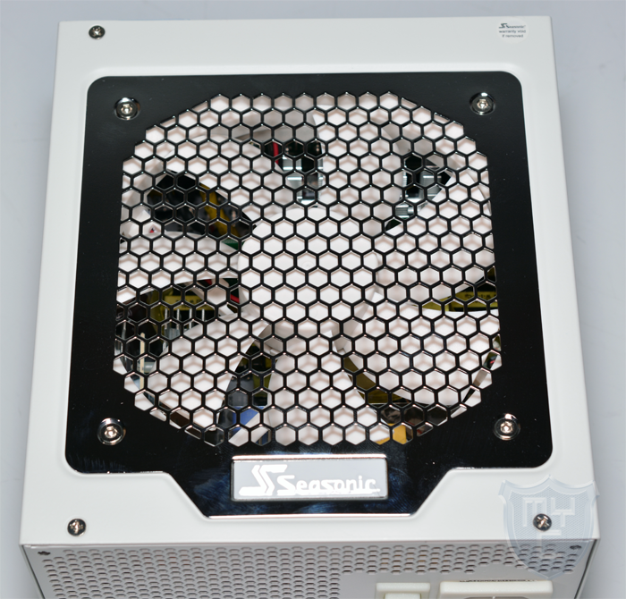 Schaut man sich einmal die Unterseite des Netzteils an, so findet man hier ein weiteres Designmerkmal vor. Hierbei handelt es sich um das verbaute Lüftergitter. Seasonic setzt hier auf ein Lüftergitter im Wabendesign, welches jedoch nicht fest in das Gehäuse eingestanzt wurde, sondern aus einer verchromte Blende besteht, welche zusammen mit dem Lüfter an dem Netzteilgehäuse verschraubt ist.