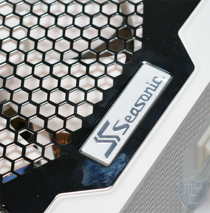 Im unteren Bereich des Lüftergitters wurde der verchromte Rahmen etwas nach unten gezogen und die hierdurch geschaffene Fläche dazu genutzt, das Seasonic Logo unterzubringen. Dieses wurde aus gebürstetem Aluminium gefertigt, was das bis jetzt sehr hochwertige Erscheinungsbild des Netzteiles unterstreicht.