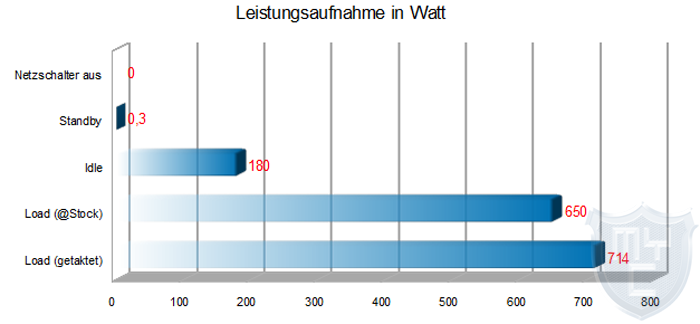 Das o.g. System inkl. Netzteil weist einen Strombedarf von etwa 180 Watt (IDLE) bis ca. 720 Watt (Volllast) auf. Diese Spannungen können jedoch je nach verwendetem Netzteil unterschiedlich sein. Unter Volllast wird besonders auf die Stabilität der Spannungen geachtet.