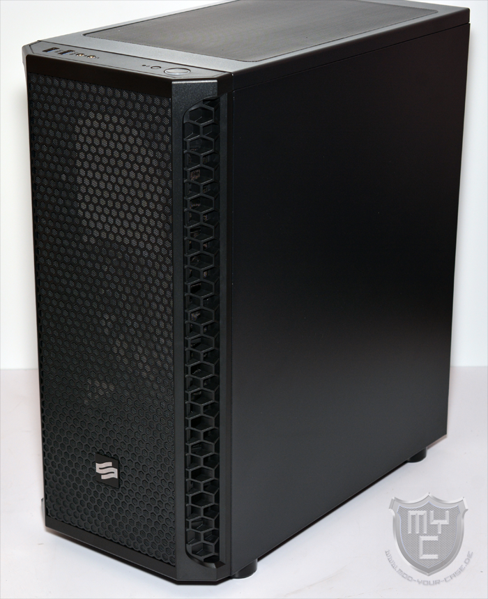 Entnimmt man den SG1 TG Midi-Tower aus seiner Verpackung, so hat man ein Gehäuse vor sich stehen, welches aufgrund der aufgesteckten Gehäusefront in einem etwas auffälligeren Design daher kommt.