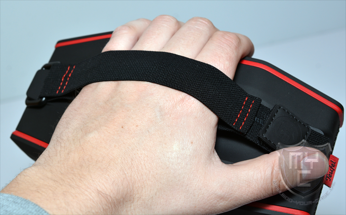 Auf der gegenüberliegenden Seite wurde das Lautsprechergehäuse mit einem hervorstehenden Steg ausgestattet, in welchem der Trageriemen eingehängt werden kann.