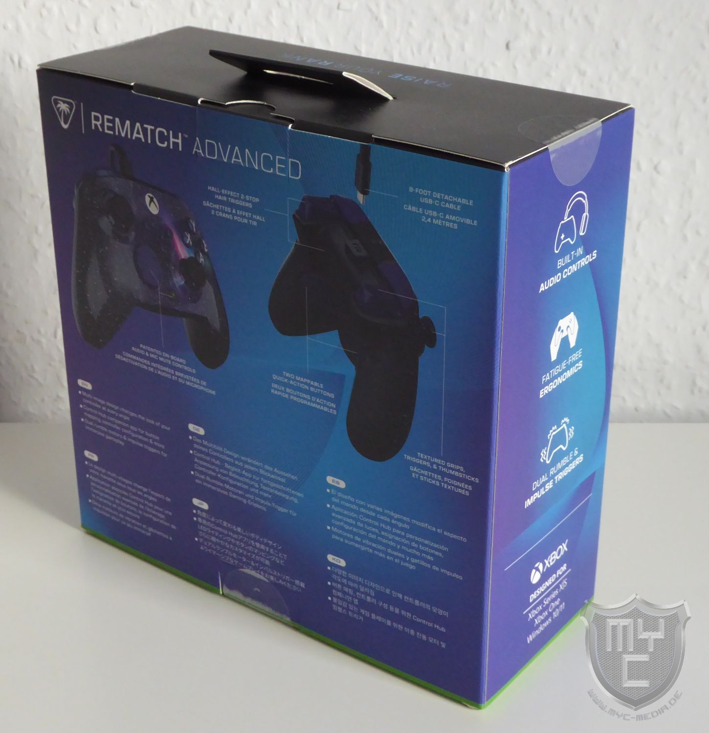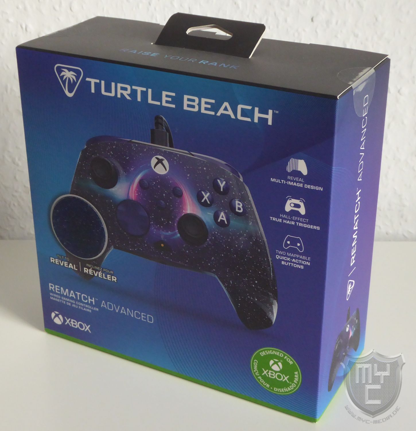 Der Rematch Advanced Controller wird von Turtle Beach in einer Verpackung geliefert, welche in einem blauen Grunddesign gehalten ist. Auf der Verpackungsvorderseite wurde neben einem Produktbild sowie der Modellbezeichnung auch einen Hinweis auf die wichtigsten Eigenschaften abgedruckt. Auch ein runder Hologramm-Sticker wurde an dieser Stelle angebracht, welcher den Farbwechsel des Controllers wiedergibt.