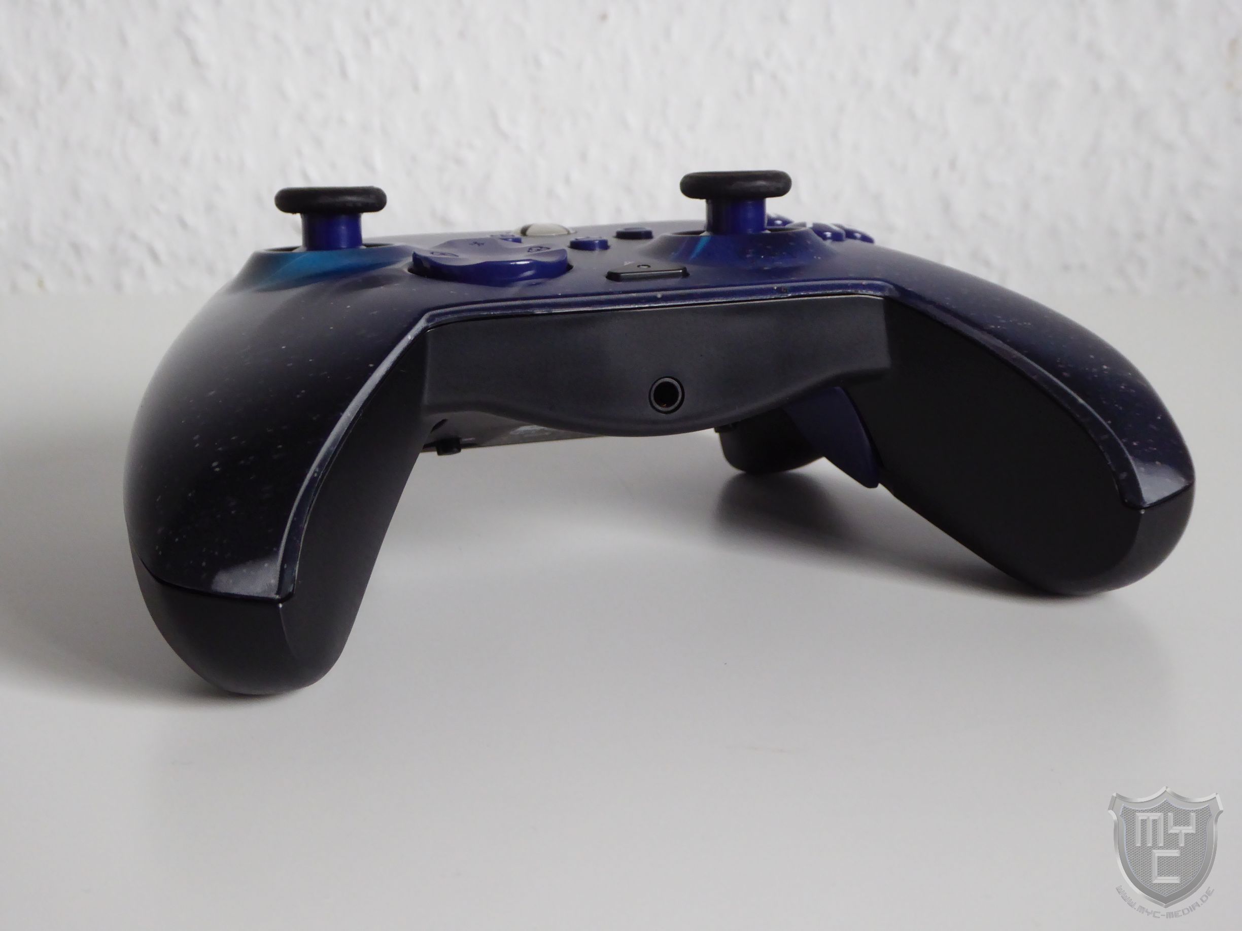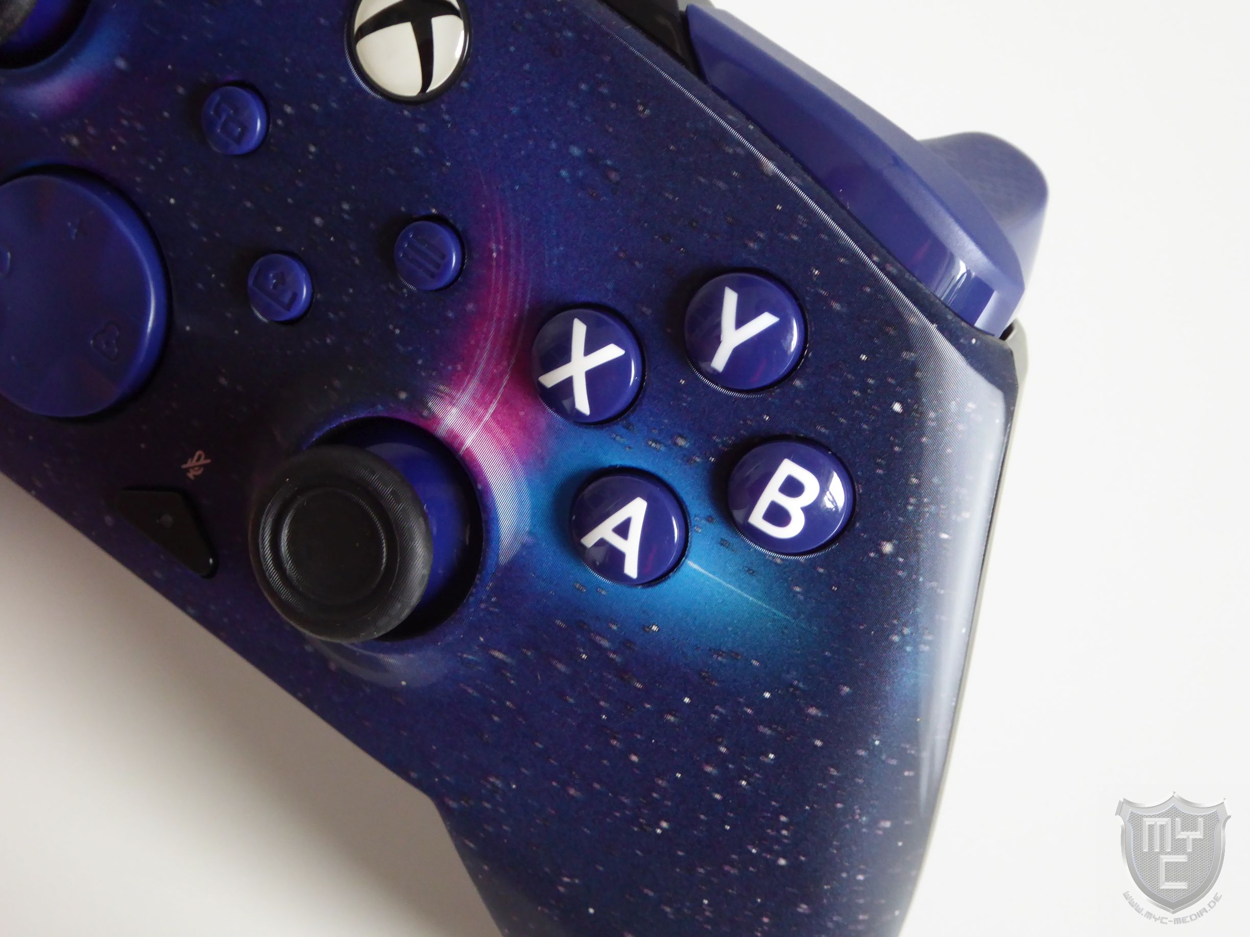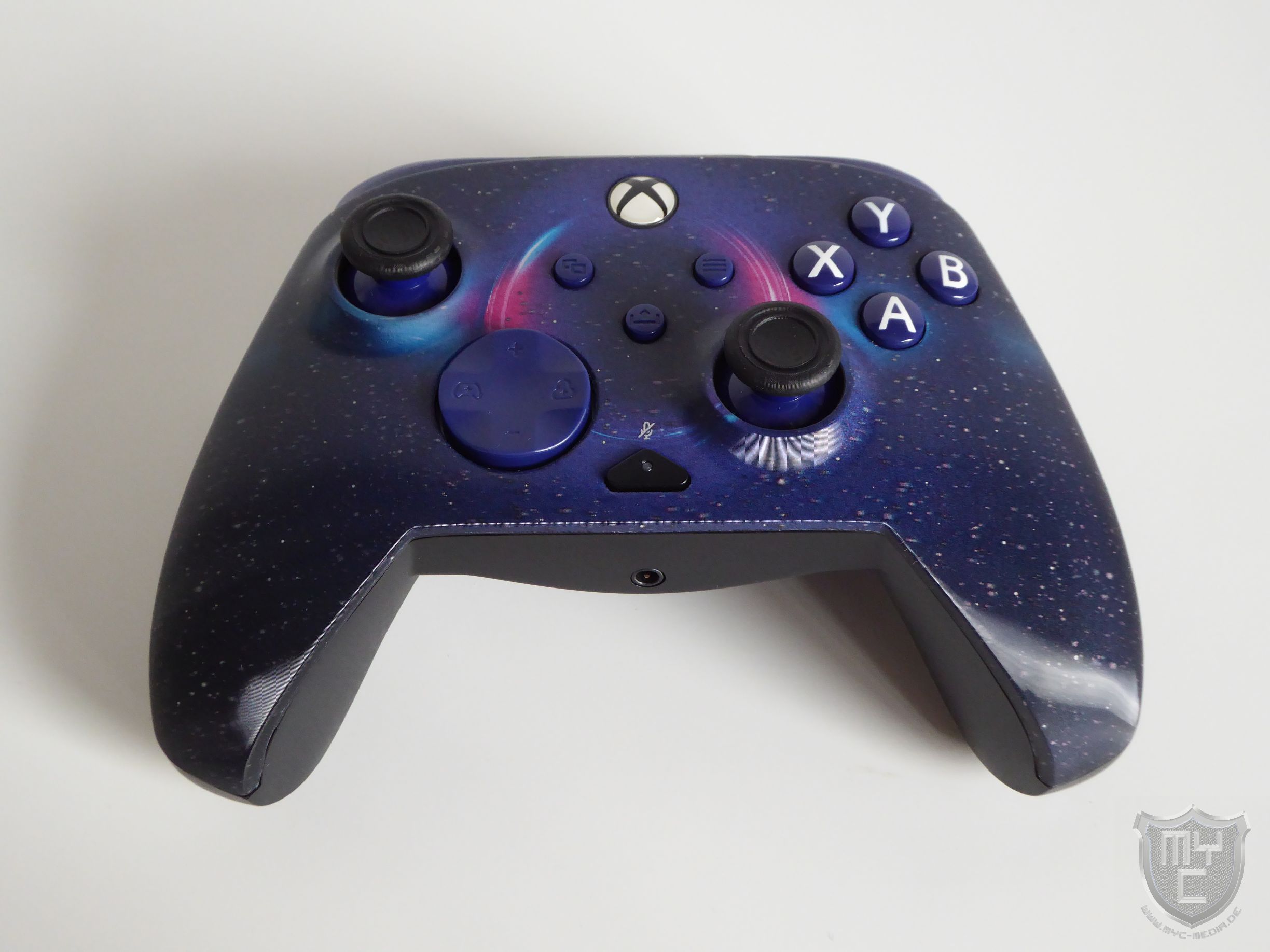 Die Vorderseite des Controller-Gehäuses zeigt ein auffälliges Design. Bei der von uns für den Test herangezogenen Farbe Dark Cosmos zeigt sich uns eine Galaxie. Verändert man den Betrachtungswinkel, so zeigen sich die Eigenschaften des speziellen Lentikular-Designs. Dieses nutzt spezielle Linsenrasterfolien, um je nach Blickwinkel die Lichtbrechung des Drucks zu verändern und dadurch 3D-Effekte zu erzeugen. Hierdurch hat der Remacht Advanced Controller aus allen Blickwinkeln auf der Oberseite einen anderen Look.