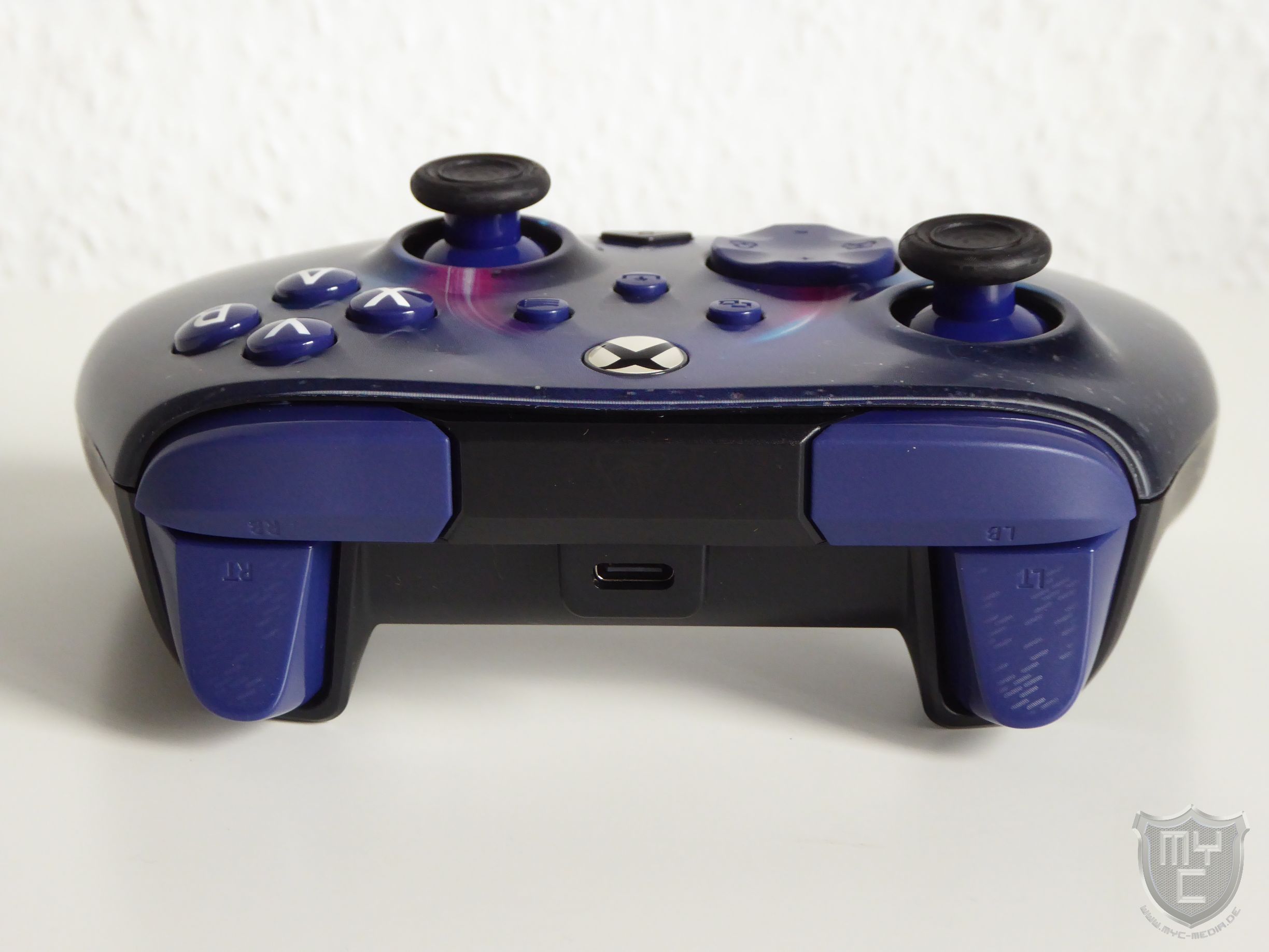 Mit einem Blick auf die Rückseite findet man neben den hier üblichen Trigger- und Bumpertasten, auch einen mittig in den Controller eingelassenen USB Type C Anschluss vor.