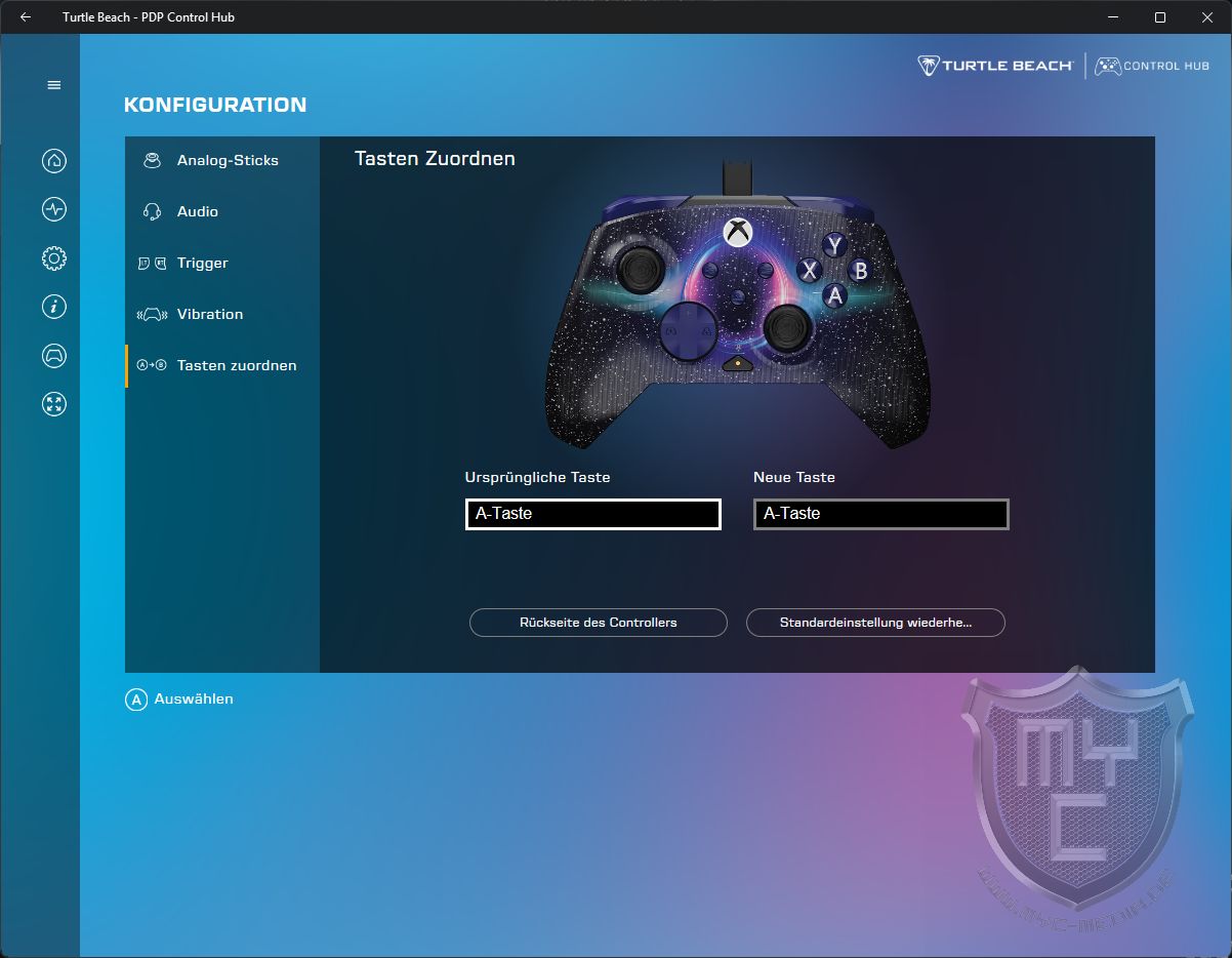 Mit dem Rematch Advanced hat Turtle Beach ein Gamepad in seinem Sortiment, welches sich nicht nur an Nutzer einer Xbox richtet, sondern auch an Gamer, welche ihre Lieblingsgames gerne mit einem Gamepad am PC oder Notebook spielen. Was das gebotene Handling angeht, profitiert der Rematch Advanced Controller stark von einer Bauform, welche an die Größe und Form eines original Xbox Controllers angelehnt ist. Dank dieser gewohnten Bauform sowie der strukturierten Griffflächen liegt der Controller recht gut in der Hand. Zudem konnten wir in unserem Test alle Bedienelemente schnell und angenehm erreichen. Dies gilt vor allem für die beiden auf der Unterseite verbauten Schnellwahltasten, welche sich wie alle anderen Tasten mit der bereitgestellten Software frei belegen lassen. Der Druckpunkt der verbauten Tasten wurde seitens Turtle Beach angenehm straff ausgelegt und lässt somit eine präzise Bedienung zu. Das Umschalten auf die digitalen Hall-Effekt-Trigger ist simpel und bietet bei Shootern einen wertvollen Zeitvorteil. Dank der sehr ähnlichen Bauform sowie fast identischer Tastenanordnung bedarf es zudem nur einer geringen Eingewöhnungszeit. Das mit einem auffälligen 3D-Effekt bedruckte Gehäuse gibt dem Rematch Advanced Dark Cosmos berechtigterweise seinen Namen. Preislich sortiert sich der sauber verarbeitete Rematch Advanced Controller von Turtle Beach mit einem Preis von knapp 35 € 🛒 im unteren Preissegment ein und bietet einem somit ein sehr gutes Preis-Leistungs-Verhältnis. Neben der von uns getesteten Variante “Dark Cosmos” bietet Turtle Beach gleich neun weitere Designs an.