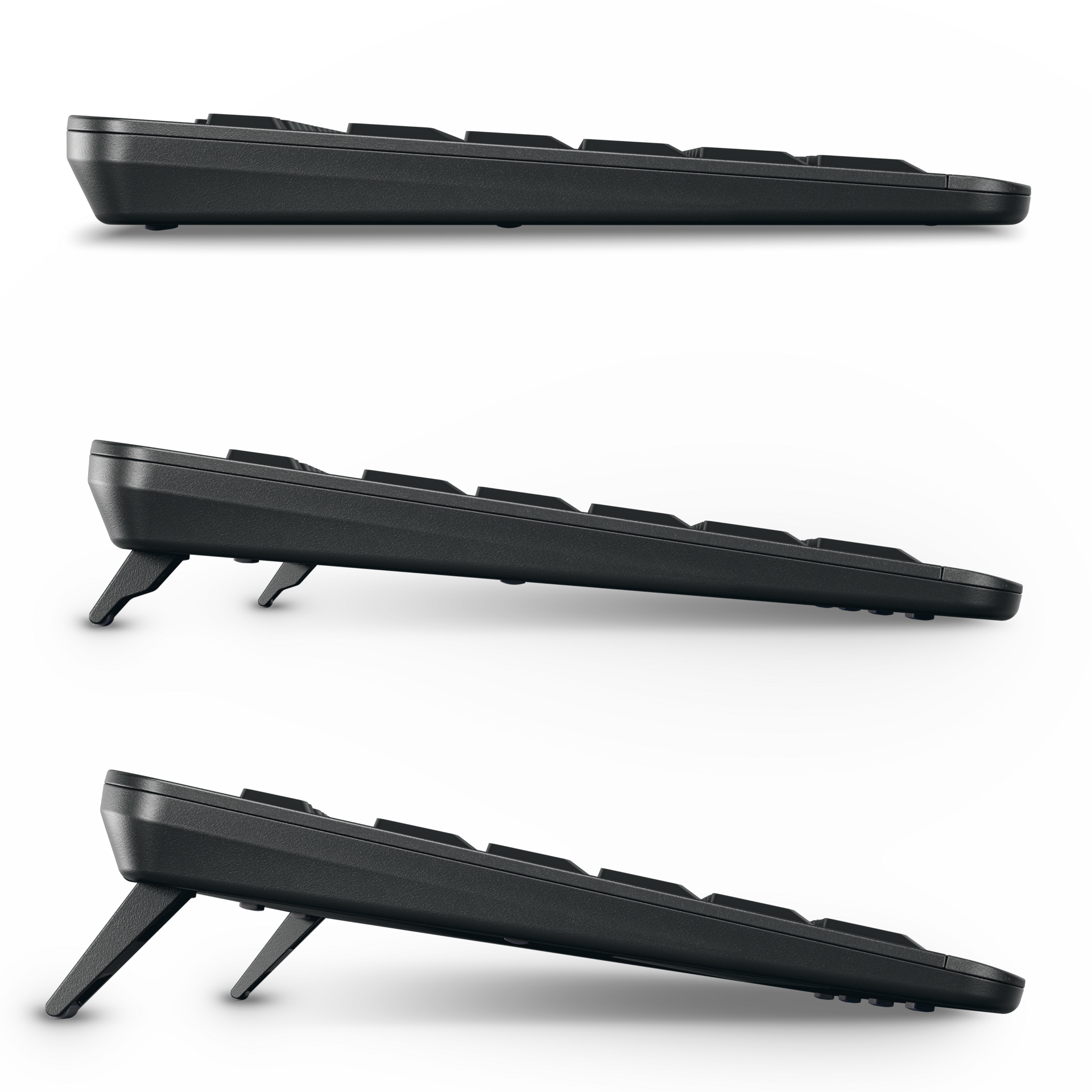 Drei einstellbare Neigungswinkel (0°, 4°, 8°), eine stabile Metallplatte und gummierte Füße bieten ergonomischen Komfort und zuverlässigen Halt. Acht Hotkeys für Medien und Office-Funktionen beschleunigen den Workflow, während die integrierte Co-Pilot-Taste den direkten Zugang zu KI- Unterstützung eröffnet. Der Akku hält mit einer einzigen Ladung bis zu fünf Monate durch, für dauerhaft unterbrechungsfreies Arbeiten.