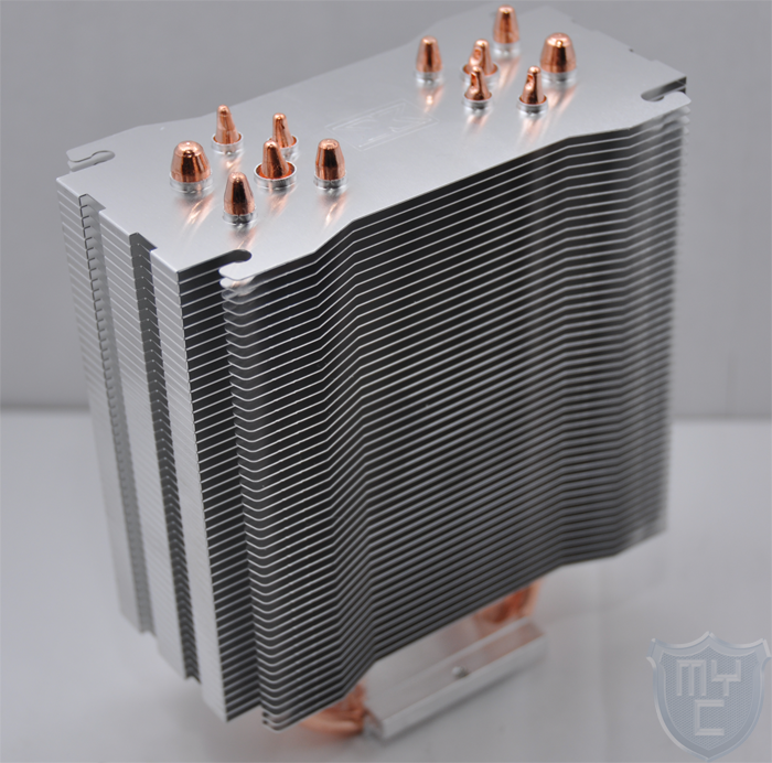 In erster Linie handelt es sich um einen Kühler mit DIRECT TOUCH HEATPIPES, wie man sie von vielen Kühlern kennt. Hierbei kommen vier Heatpipes zum Einsatz. Zwei haben einen Durchmesser von 8mm und zwei weitere einen Durchmesser von 6mm. Die vier Heatpipes werden am Boden des Kühlers mittels eines entsprechenden Alublockes in Form gehalten.