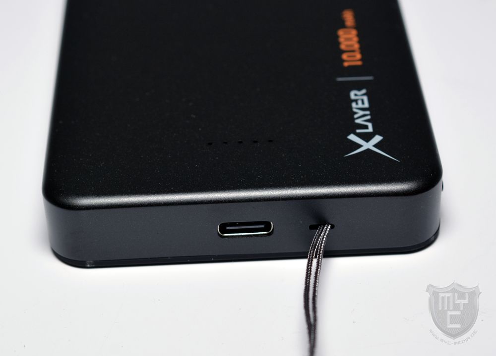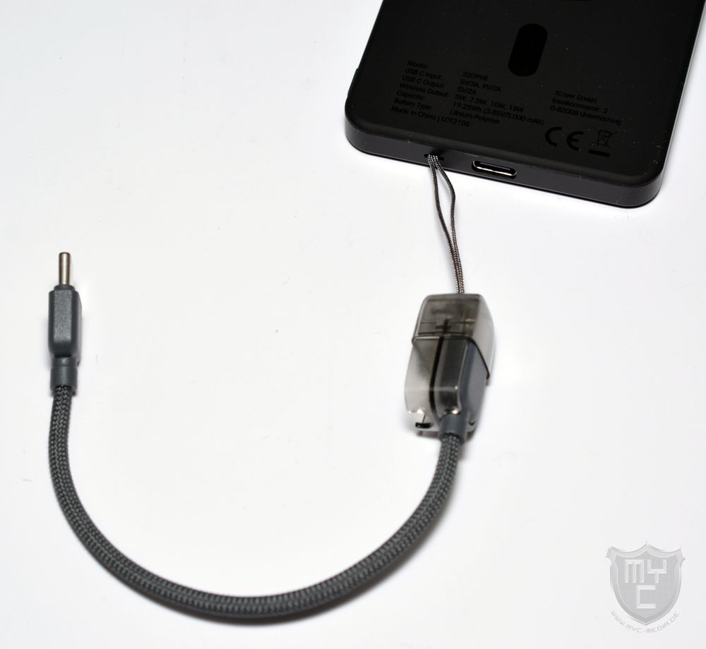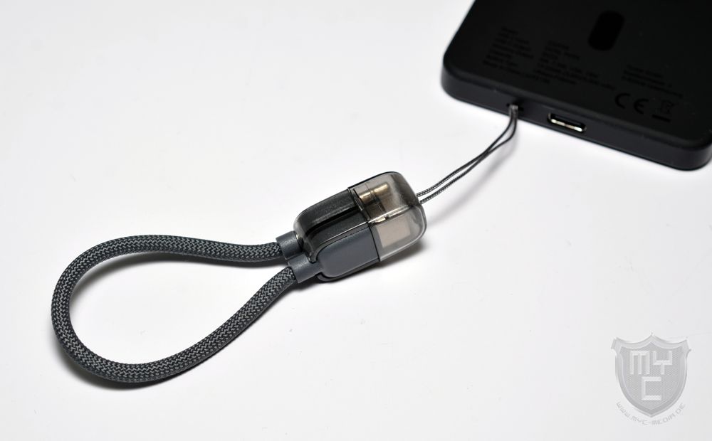 Schaut man sich diese Trageschlaufe einmal etwas genauer an, so wird man schnell feststellen, dass XLayer an dieser Stelle nicht einfach nur auf eine stabile Schnur zurückgegriffen hat, sondern XLayer hat sich an dieser Stelle eine clevere Lösung einfallen lassen, welche ein rund 15 cm langes USB-C-Kabel zum Teil der Trageschlaufe macht,